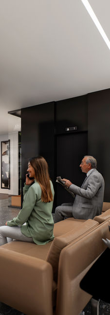 The lounge in the entrance is designed to be an inviting, cozy retreat that subtly contrasts with the rest of the entrance, creating a distinct zone while maintaining a harmonious connection to the overall design.